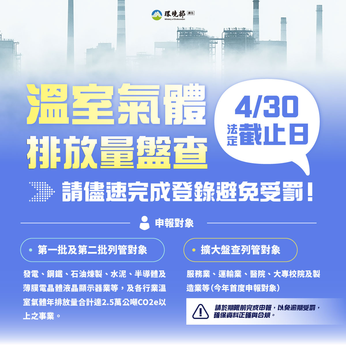 每年4月30日為法定溫室氣體排放量盤查資料的登錄截止日。環境部特別提醒,申報截止在即,無論是過去長期列管的排放大戶,或是去(114)年公告納管需於今年首度申報的擴大盤查對象,務必於限期內完成登錄,若未依期限完成者,將依規定限期補正,逾期仍未